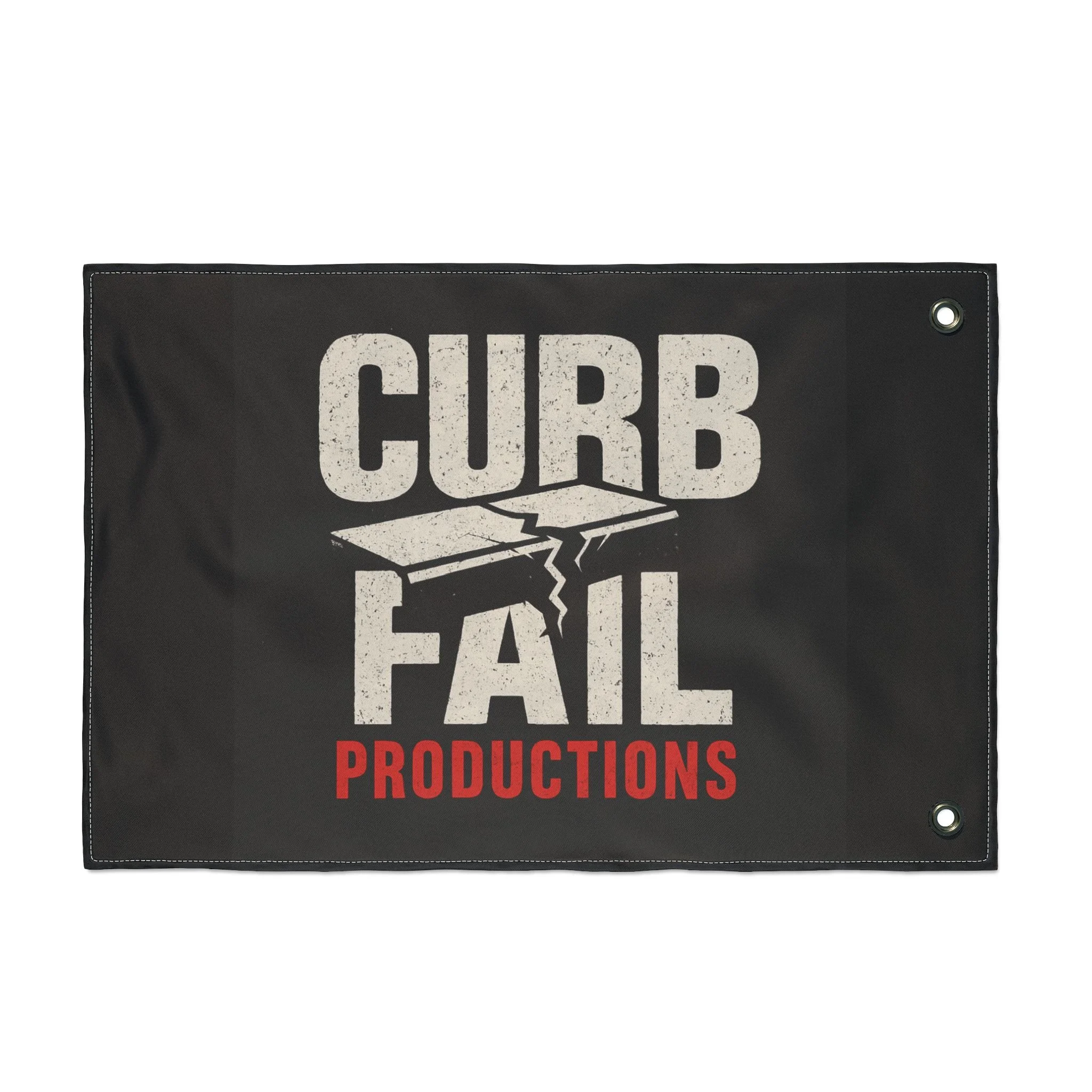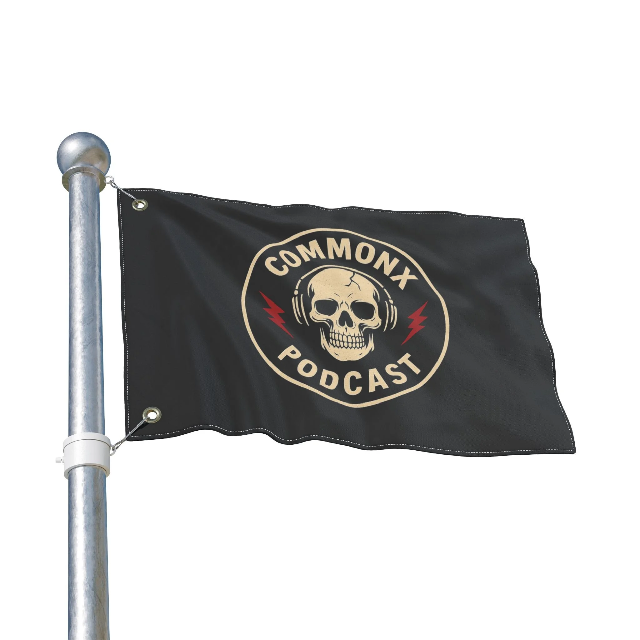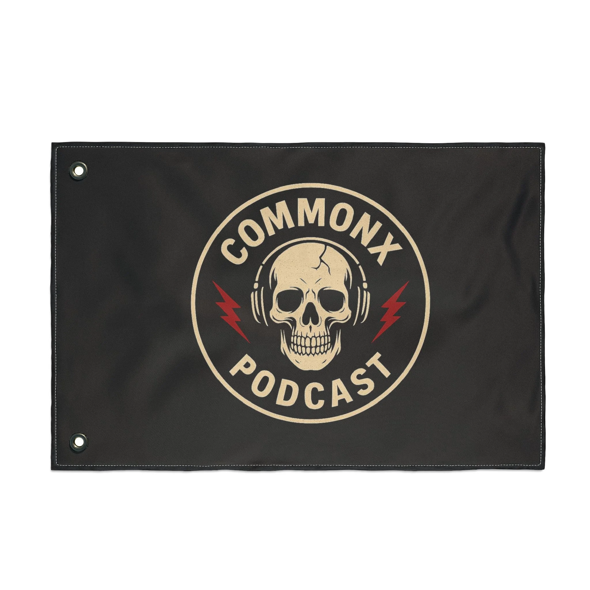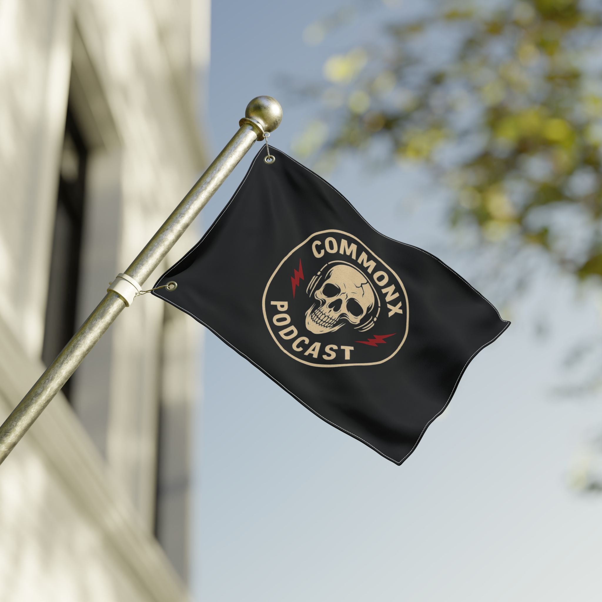 Double-Sided Podcast Flag — 'Commonx Podcast' Skull & 'Curb Fail Productions' Logo